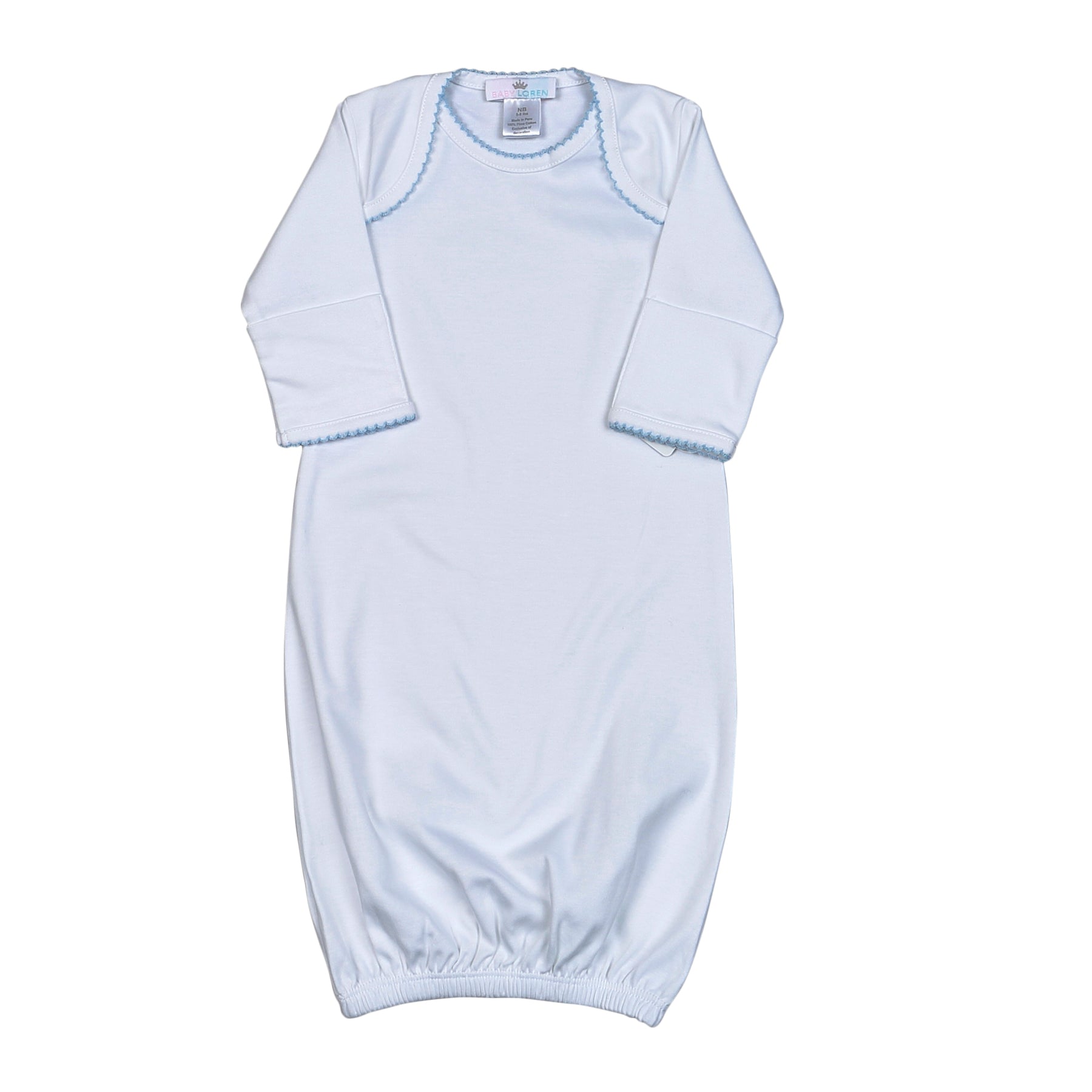 WBP-020 White Gown Blue Picot Trim. Cut on Chest